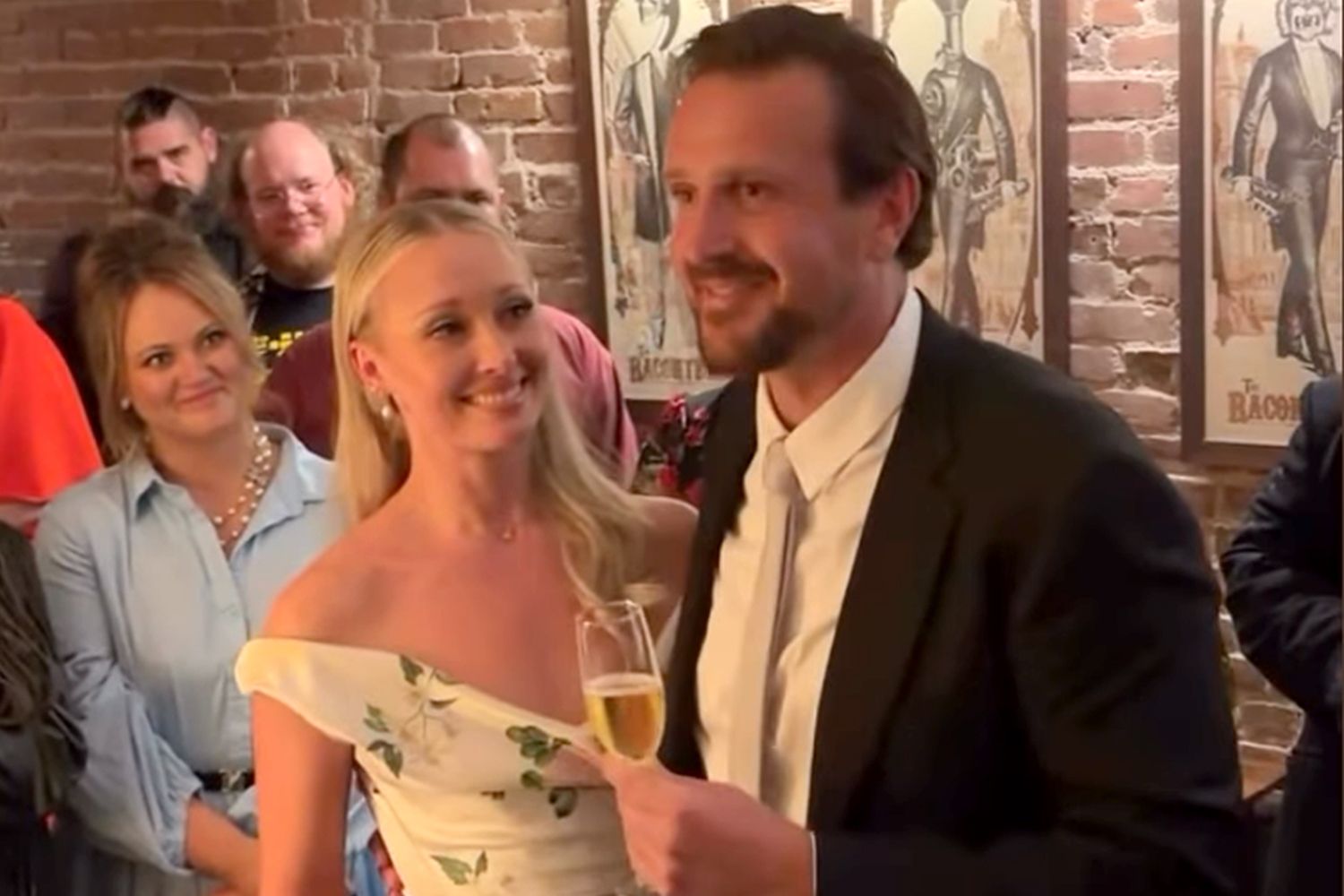 At their engagement party, Segel and Radomski were snapped sharing a kiss in front of guests and raising their glasses. Radomski was also seen taking a bathroom selfie at the restaurant alongside three of her bridesmaids.