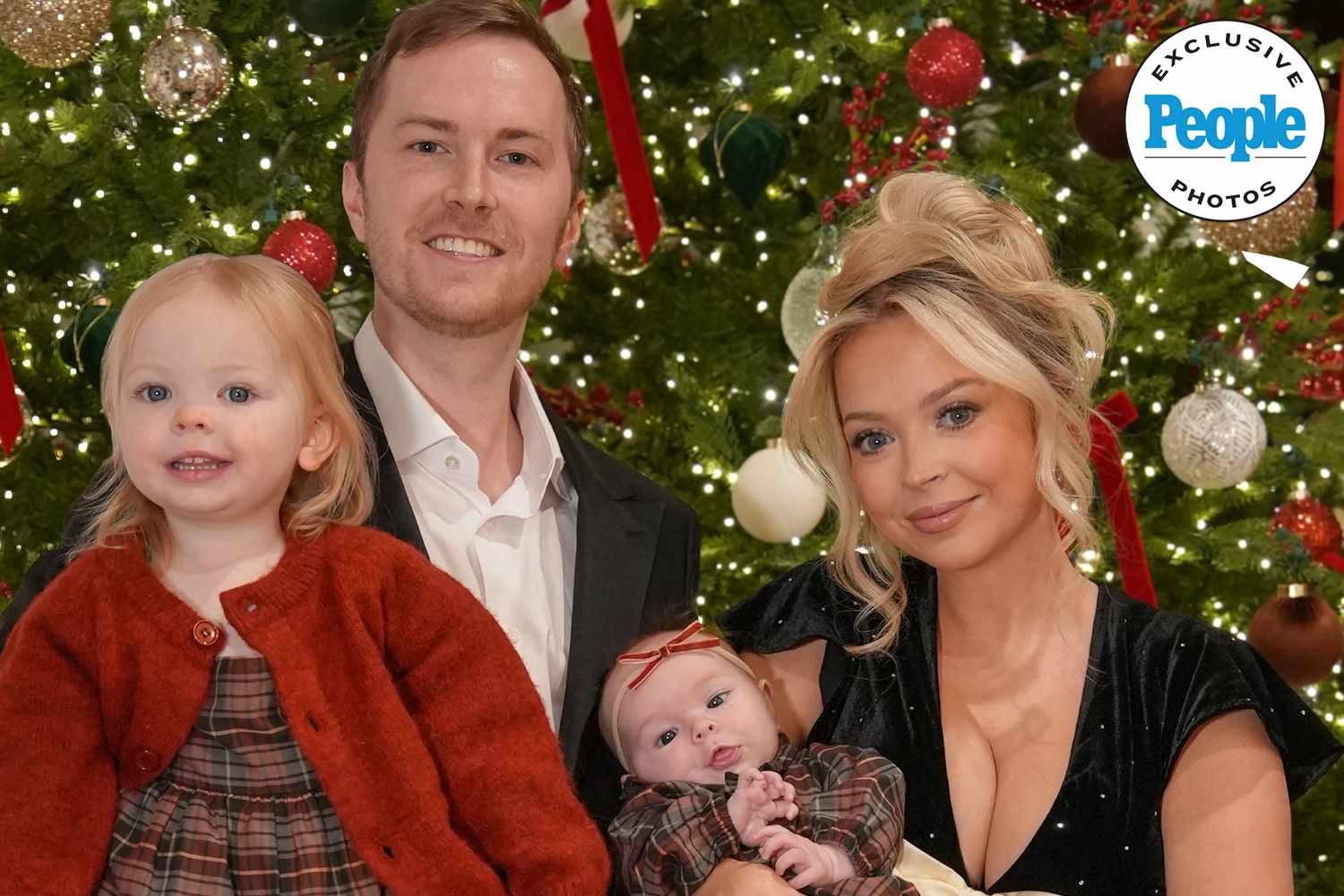 Kay and Tay smile behind their daughters, posing in front of a Christmas tree. Not pictured is Kay’s oldest daughter Kinsley, 13, whom she welcomed in a previous relationship.