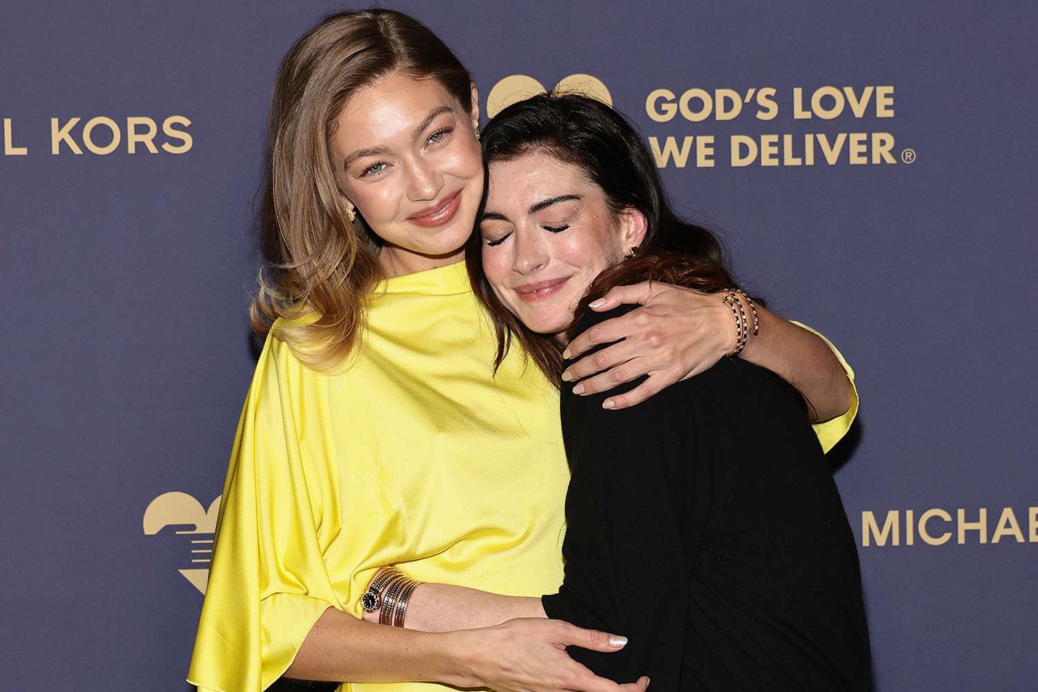 Anne Hathaway gives Gigi Hadid a tight squeeze at God’s Love We Deliver’s Golden Heart Awards in New York City on Oct. 20.