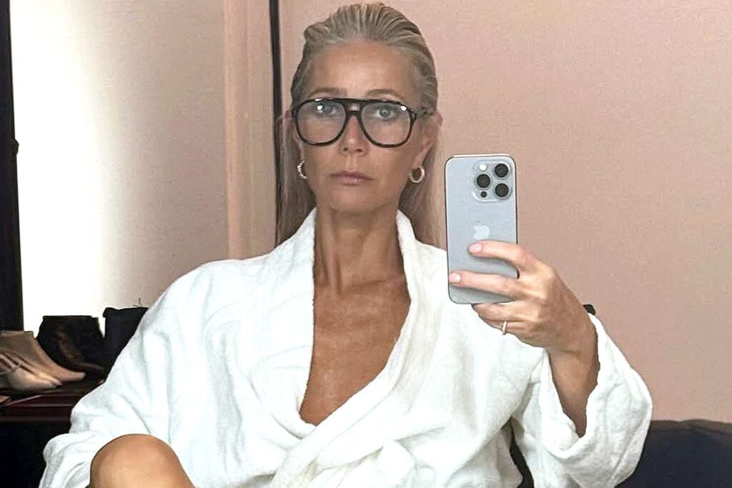 In the first photo, Paltrow can be seen sitting pantsless in a styling chair while wearing a white robe with one leg up and crossed over the other.