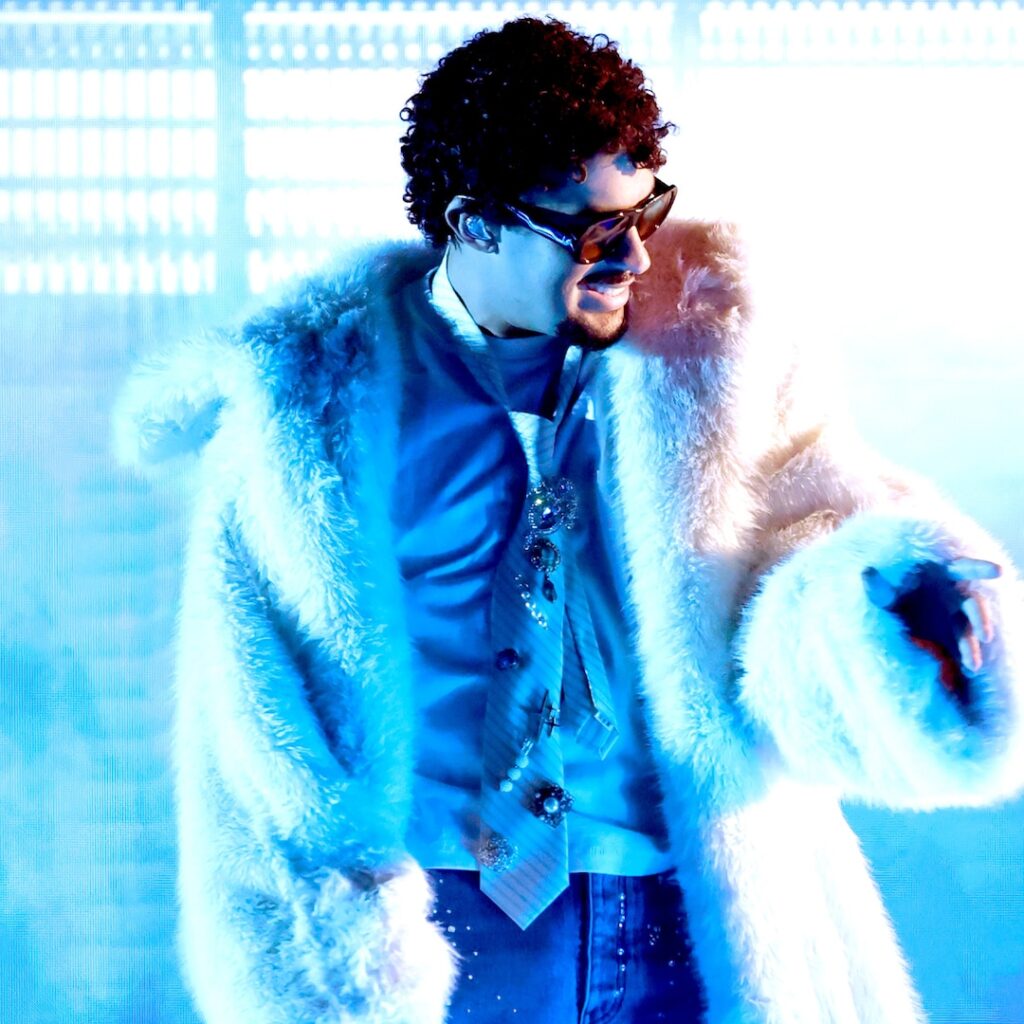 “It’s going to be a huge party,” vowed the Puerto Rican artist, who held court at a Feb. 5 press conference in a gray pinstripe Bottega Veneta suit, faux-fur coat and a beanie sporting a subtle bunny ears silhouette. “I want to bring to the stage, of course, a lot of my culture. But…I don’t want to give any spoilers. It’s going to be fun.”