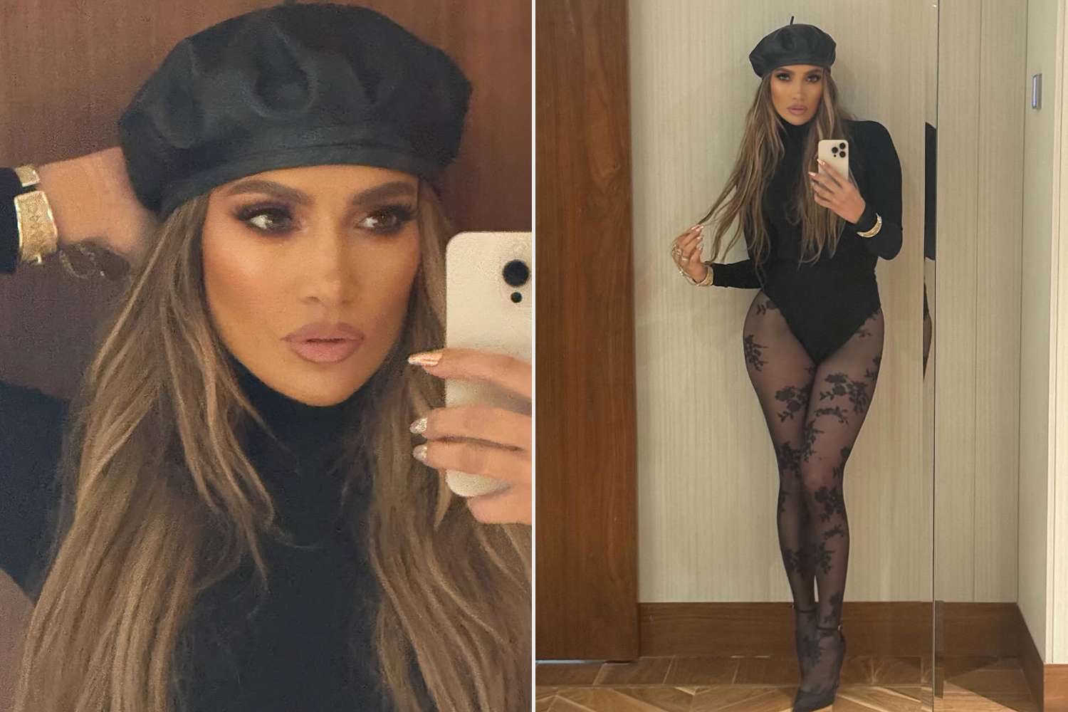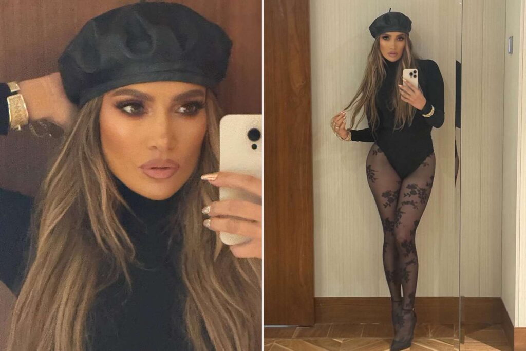 On Monday, Aug. 11, the “Let’s Get Loud” singer, 56, shared new outfit photos to Instagram showing off her latest offstage look. The sexy snaps show her putting on a leggy display in nothing but lace tights, black stilettos, a turtleneck unitard and a leather beret. She accessorized the monochromatic look with gold jewelry.