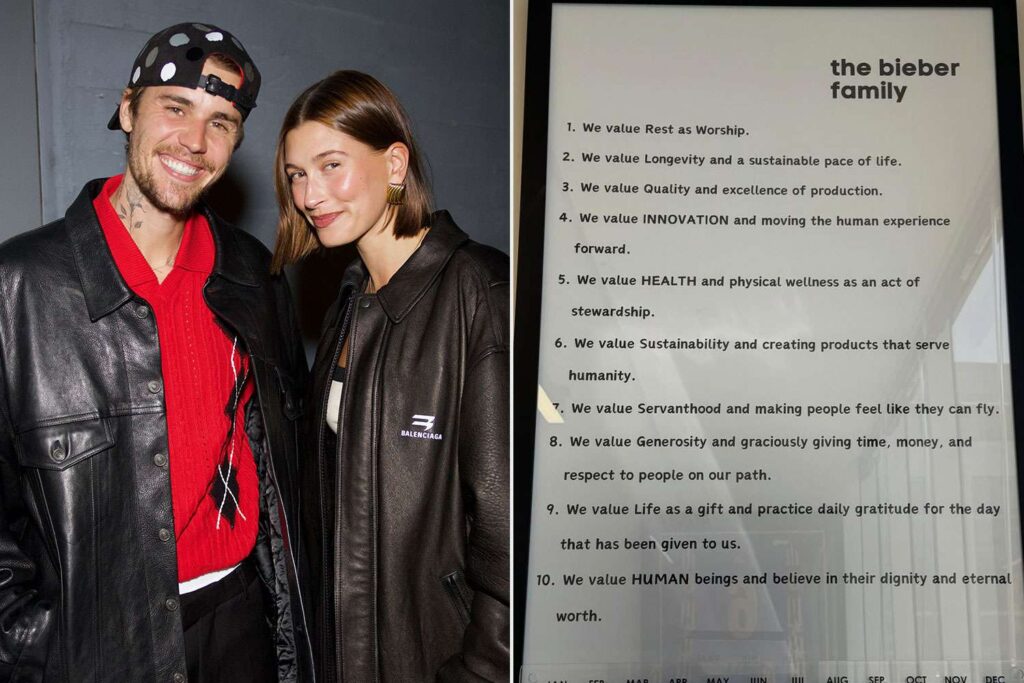 Sharing an image of wall art with a list of 10 items and “the Bieber family” written at the top, one line read, “We value Longevity and a sustainable pace of life,” as another said, “We value Servanthood and making people feel like they can fly.”