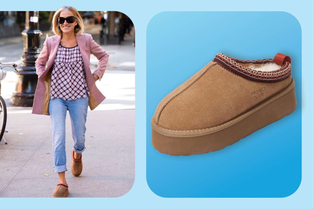 The actress’s shoes were from the brand I’ve sported religiously for almost two decades, so of course I was immediately obsessed. Parker wore the Ugg Tazz II clog slippers, which are made from genuine suede with sheepskin lining, rubber platform soles, and colorful whipstitched trim that complemented her red-and-pink plaid babydoll top. She finished the look with a pink wool coat and rolled straight-leg jeans.