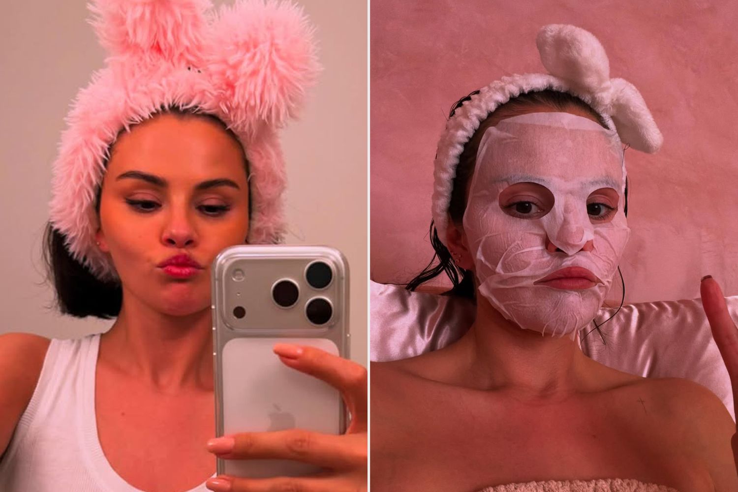 On Monday, Feb. 2, the singer and actress, 33, shared a carousel of photos captioned “lately,” which included a hilarious image of her treating her skin to some tender loving care while wearing a white face mask and ribboned headband.