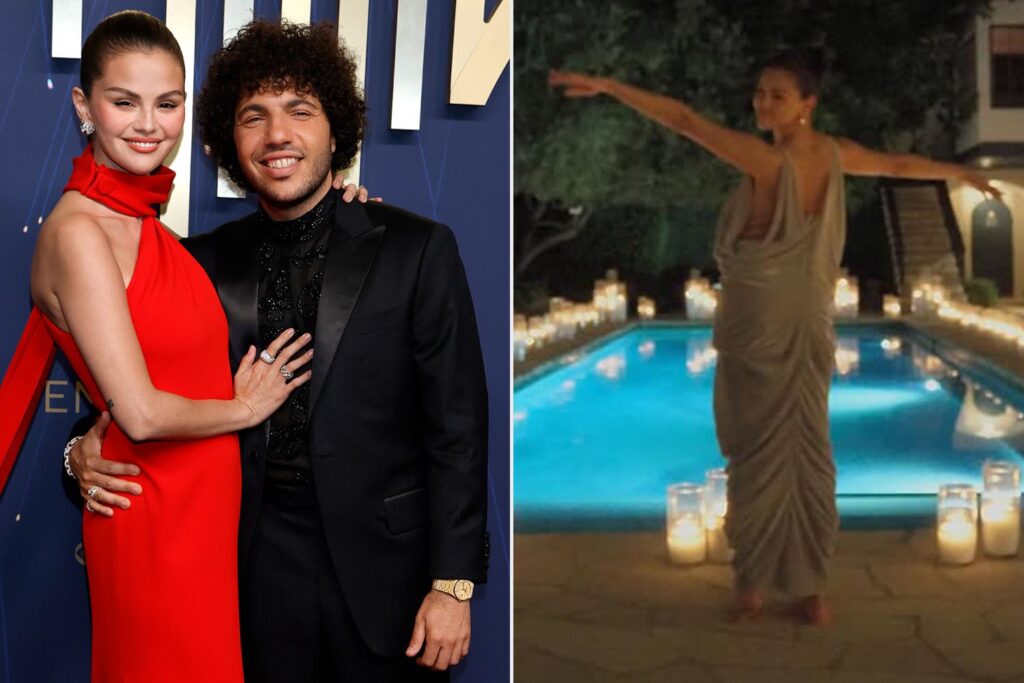 In one of the pictures, Gomez smiled with arms outstretched as she stood by her swimming pool surrounded by lit candles. The actress wore a ruched gray Louis Vuitton gown and styled her hair in a sleek bun.